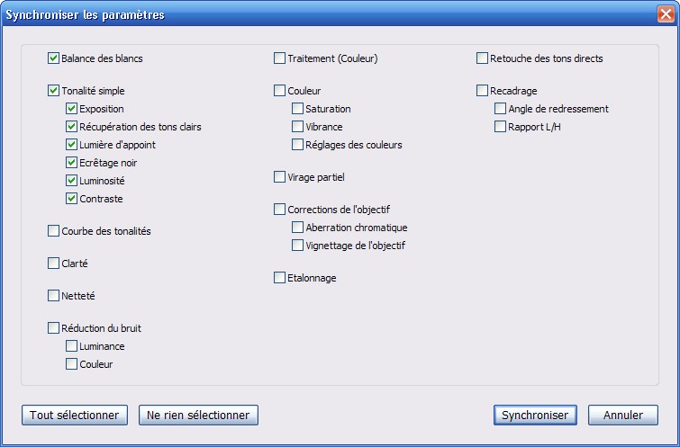 On coche les réglages que l'on veut propager puis on clique sur "synchroniser". Les réglages de la "photo témoin" sont alors répercutés sur toutes les autres.