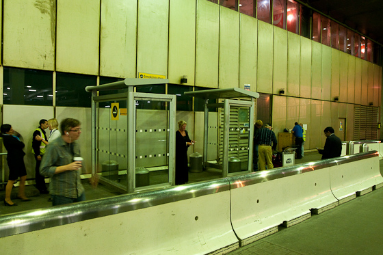 Départ de Toulouse ce samedi 26 à 18h. Première étape : Londres, avec la perspective de faire remonter le taux de nicotine avant une plongée de plus de 20h pendant lesquelles il faudra faire confiance au patch.Je me voyais donc déjà fumant tranquillement devant l'aéroport d'Heathrow pendant les deux heures d'attente du vol 714 pour Sydney (ah non, c'est pas le 714). Et bien sachez qu'au terminal 4, au moins lui, il n'est pas autorisé de fumer à l'EXTERIEUR : des zones (immondes) ont été créées pour parquer les fumeurs. Sous un éclairage glauque, les pestiférés du 21ème siècle s'entassent pour griller leur tiges.