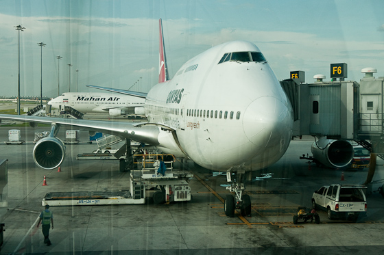 Voici au travers des vitres sales de l'aéroport le gros navion. C'est un 747 et non pas un Airbus 380. Désolé Matthieu, il aurait semble-t-il fallu que je choisisse Singapore Airlines pour monter dans le monstre européen. Prochaine fois... ;-)